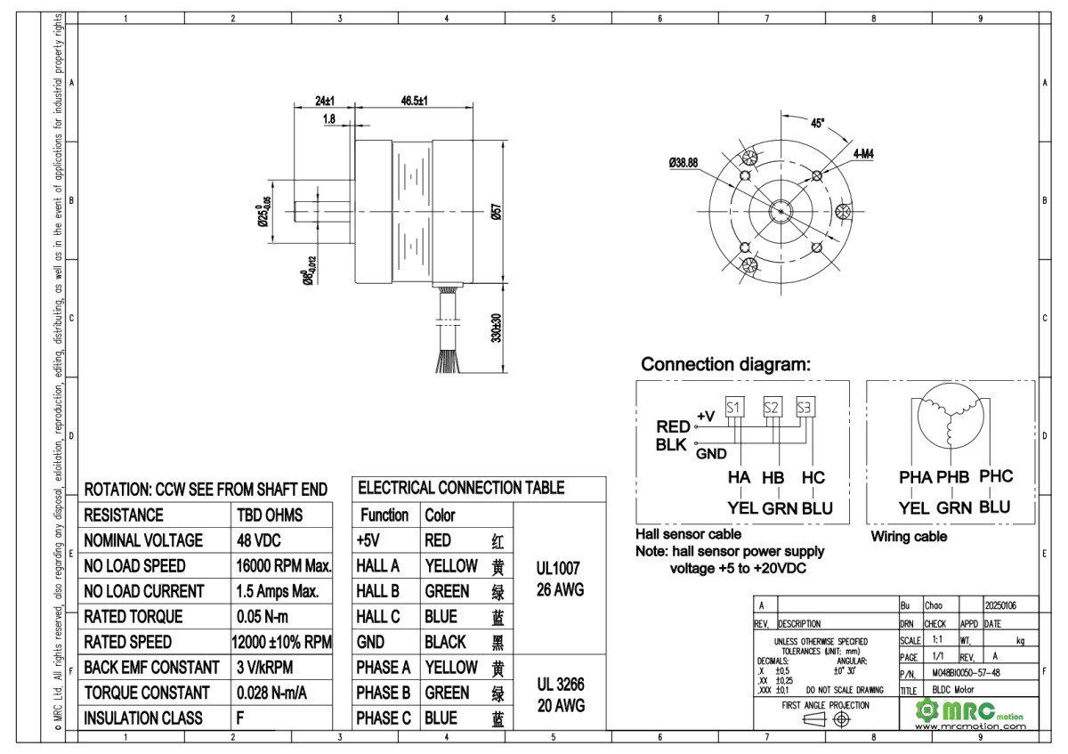 Inner Rotor Brushless Motor, φ57mm, 48VDC, 12000RPM, 0.05Nm, 63W